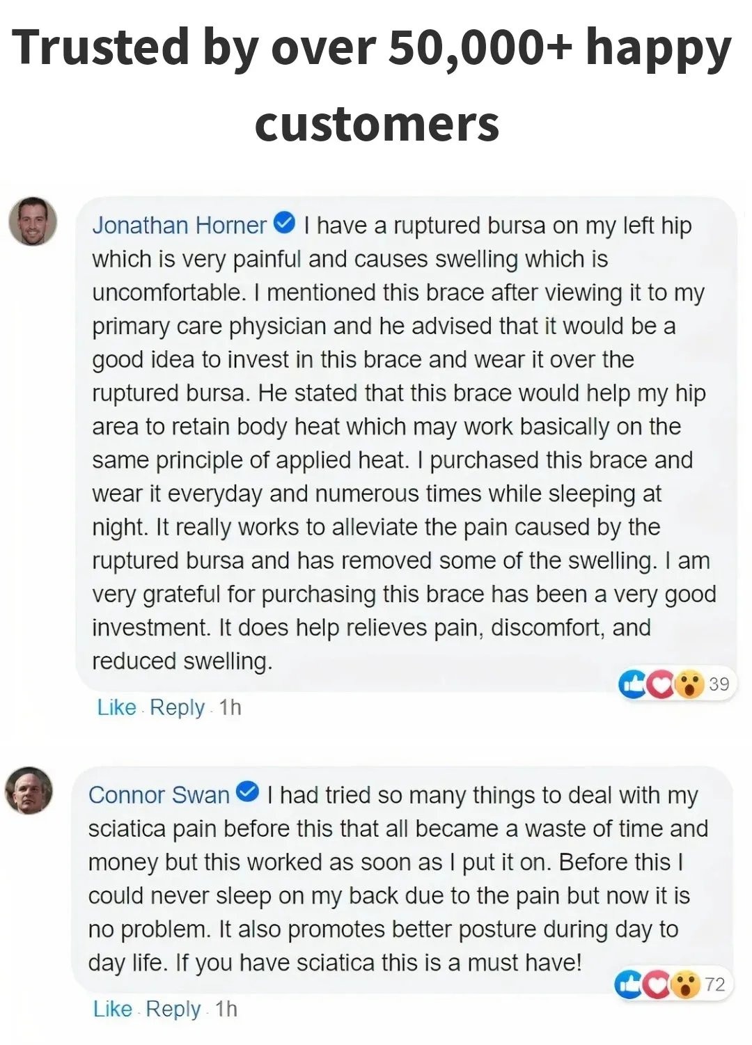 I canāt believe it! I had a polio as a child it affected my right leg I was 4years old then and now 50. I am a nurse and I managed to work for more than 30 years full time. I always had hip & knee pain since my body posture and hip alignment is very poorly..I have a tiny bone on my knee that was rubbing against each other and it causes me a lot of pain when going up & down the stairs and simply when walking. My Ortho Surgeon wanted me to get a physio therapy for my knee but that was before the pandemic.. I canāt live with so much pain. I already lose some weight but the rubbing pain was still there.. I read about this hip brace googling about osteoarthritis pain so I am like ok why not try-So to make it short I ordered one for my left side (Large). Very fast delivery..I put it on as soon as I got it earlier and in a matter of 3hours my pain suddenly disappear..I tried going up and down the stairs and I have no pain at all. I almost cried since the pain on my hip and knee was really bothering me and affecting my life. Now when I am walking with this brace I can feel that it pushes my left knee on much better position and alignment and it relieves the pain both on my knee & hip..I oredered two more so I can have a spare when I go to the gym..I am not sure if this brace will going to help you but for me I am a believer..š Donāt hesitate! Donāt live in pain try this brace ASAP..š They are not paying me for this review but I just have to share my experienced with this life changing Hip Brace.